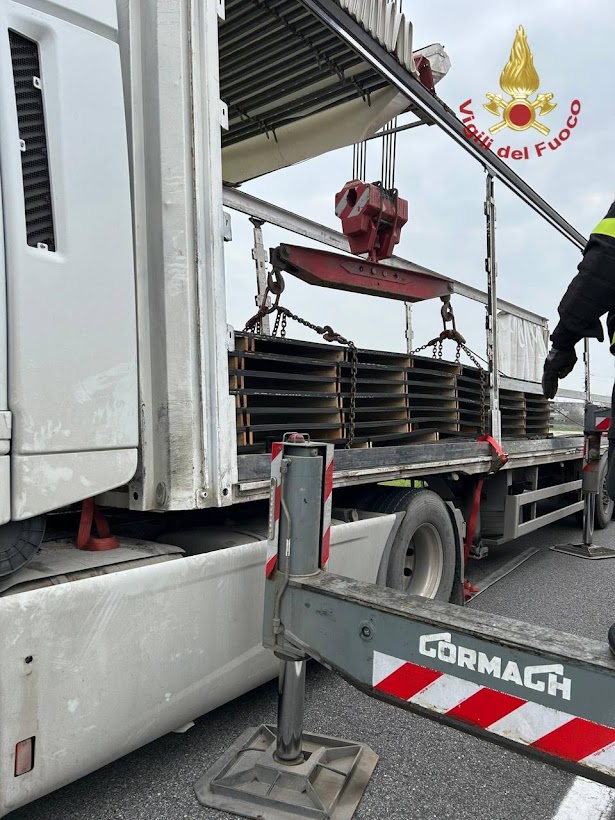 Perciò i Vigili del Fuoco del comando di Rovigo e di Adria sono giunti sul posto con un’autogru. Infatti, grazie al mezzo, i pompieri hanno potuto sollevare le lastre e riposizionarle sul semirimorchio.