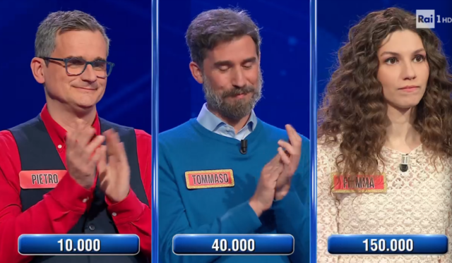 Si arriva così al triello, composto da Pietro, Fiamma e Tommaso. Pietro sceglie il tema “Donne nella storia” e trova subito il “piglia tutto”, che però non viene sfruttato: la domanda risulta troppo complessa e nessuno riesce a rispondere correttamente.